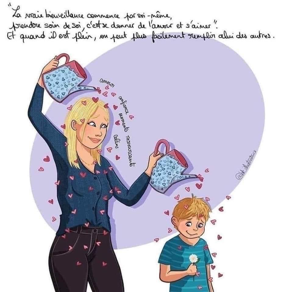 Mon fils lève les yeux de son livre et me murmure, « il faut qu’elle apprenne à prendre un « me time » sinon forcement, son verre il déborde ».